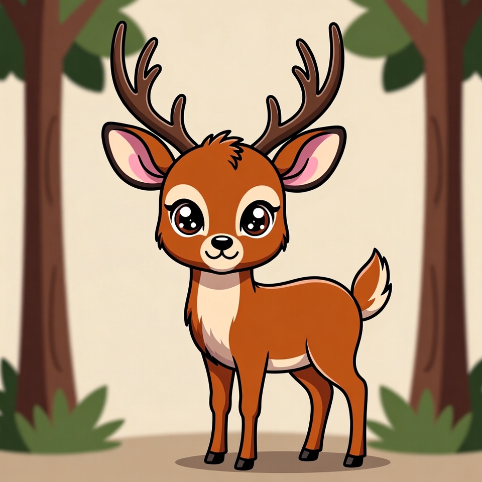 A kawaii-style cartoon deer with large sparkling eyes and antlers stands in a forest setting. It has a brown coat, white underbelly, and fluffy tail, surrounded by green trees and bushes on a light background. The illustration features bold outlines and vibrant colors.