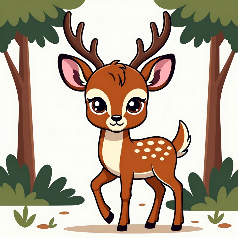 A cute illustrated baby deer with large sparkling eyes and spotted fur stands playfully in a forest setting. It has prominent antlers, pink inner ears, and a small tail. The deer is surrounded by green trees, bushes, and grass on a white background.