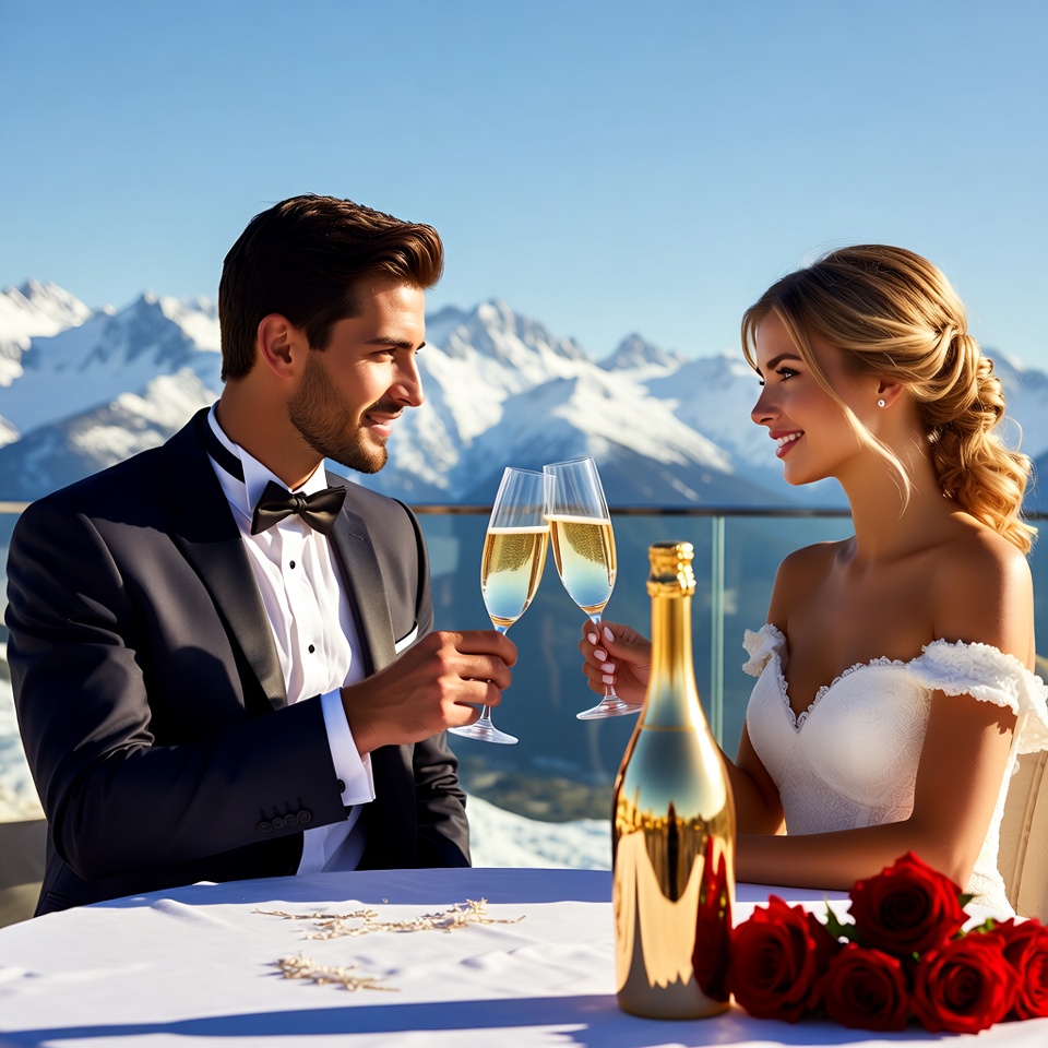 A smiling bride in a white off-shoulder wedding gown and a groom in a black tuxedo with bow tie clink champagne flutes on a terrace. A gold champagne bottle and red roses sit on the white tablecloth between them. Snow-capped mountains and blue sky form a stunning backdrop behind the couple.