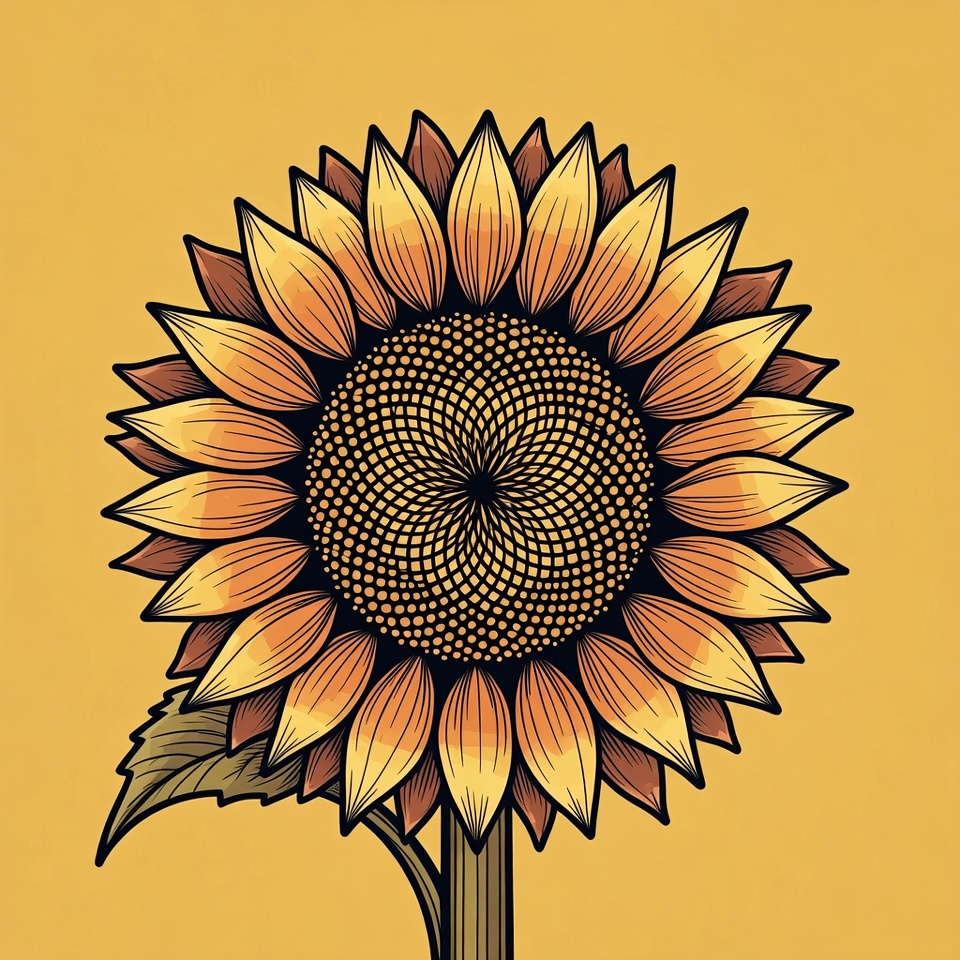A detailed illustration of a sunflower features vibrant yellow petals surrounding a textured brown center. A green stem and leaf extend from the flower. The artwork is set against a solid yellow background.