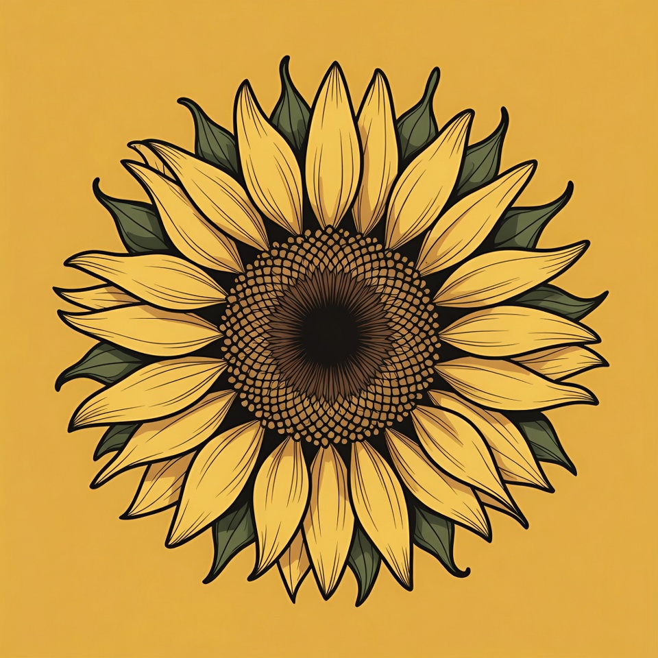 A detailed line art illustration of a sunflower features vibrant yellow petals and green leaves arranged symmetrically around a dark brown center. The flower is centered on a solid yellow background, creating a bold and isolated visual focus.
