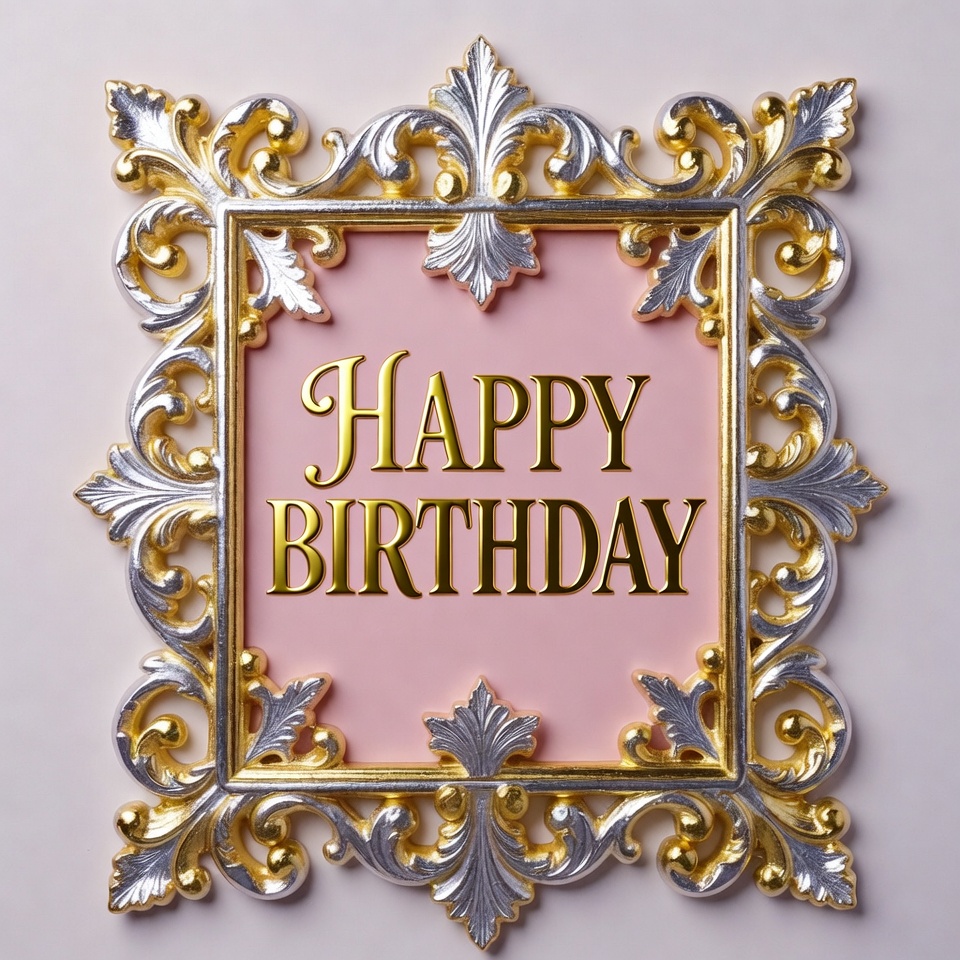 3D effect, birthday frame, birthday text, bold text, card border, celebration graphic, clipart, decorative border, elegant frame, festive graphic, floral design, gold frame, greeting card, illustration, invitation frame, isolated background, luxury design, metallic frame, ornate frame, party decoration, pink background, scroll design, silver frame, typography, happy birthday
