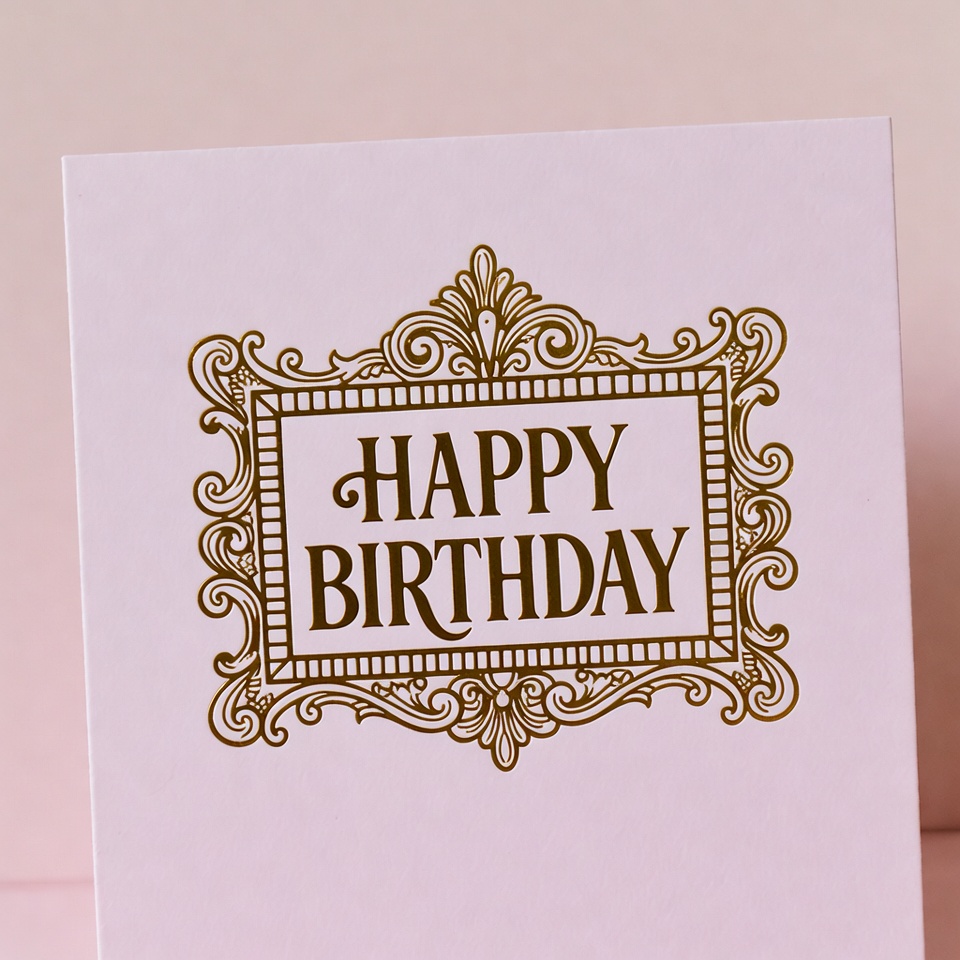 birthday card, birthday greeting, brown lettering, card design, celebration card, cursive font, decorative border, elegant text, embossed look, fancy design, festive card, filigree design, floral motif, gold frame, greeting card, holiday card, invitation card, luxury card, ornate frame, party greeting, pink background, pink card, scrollwork, typography, vintage style, happy birthday