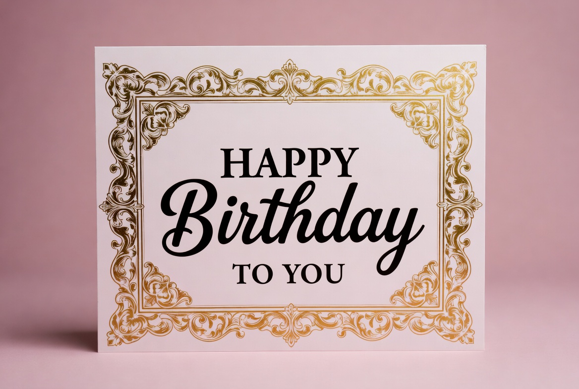 A greeting card features bold black text reading 'Happy Birthday To You' centered on a white background. It is framed by an ornate gold filigree border. The card sits on a soft pink surface.