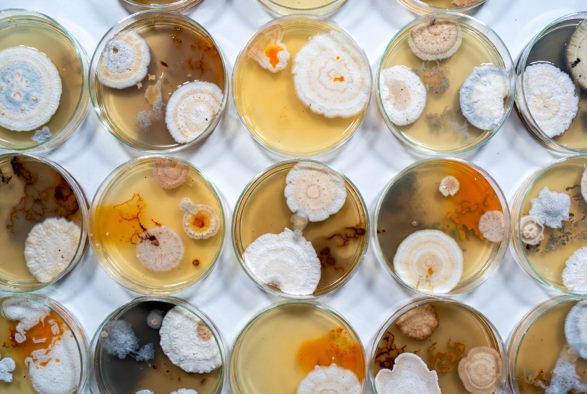 agar medium, agar plate, bacteria culture, biological sample, brown colonies, closeup, colony growth, coral-like, dish array, fungal colonies, fungus, lab sample, laboratory, macro view, microbiology, mold growth, mushrooms, orange colonies, petri dishes, research sample, science, spore culture, textured fungus, white colonies, yellow colonies, petri dish