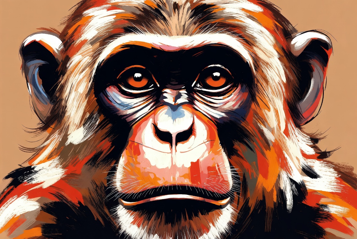 A vibrant, stylized illustration of a chimpanzee with detailed fur in shades of orange, brown, and white. The chimp faces forward with large orange eyes, a pink nose, and an open mouth on a beige background. Bold outlines and colorful shading create a dynamic pop art effect.