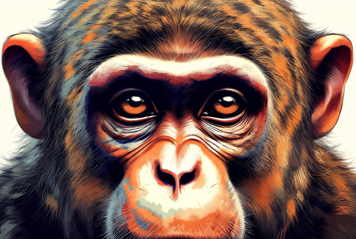 A detailed digital illustration of a chimpanzee face with expressive brown eyes and fluffy fur. The chimpanzee has a light muzzle and prominent ears, rendered in vibrant painterly style. It is isolated on a white background.
