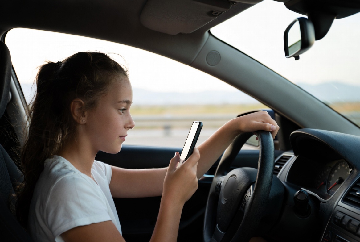 A young girl with ponytail sits in the driver's seat of a car, holding a smartphone with both hands while gripping the steering wheel. She wears a white t-shirt and focuses on the phone screen. The car is on a highway with a scenic view outside the window.