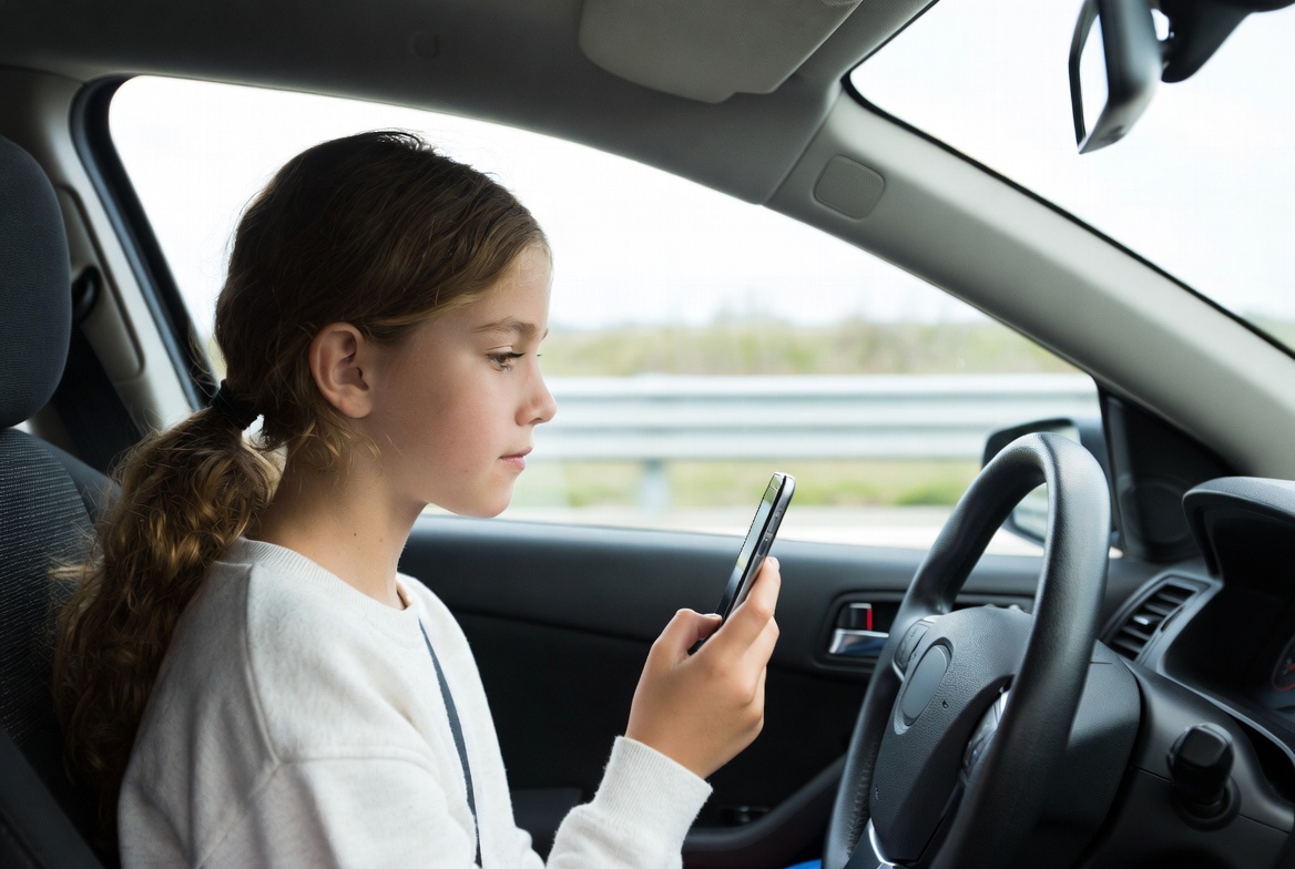 White, brown hair, car, child, distracted, driving, female, guardrail, passenger seat, phone, ponytail, road, safety, smartphone, steering wheel, texting, vehicle interior, white sweater, young girl, girl