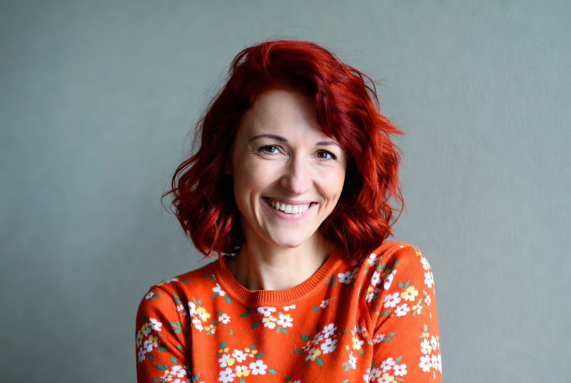 A woman with vibrant red wavy hair smiles warmly at the camera. She wears an orange sweater adorned with white floral patterns. The image features a plain gray background.