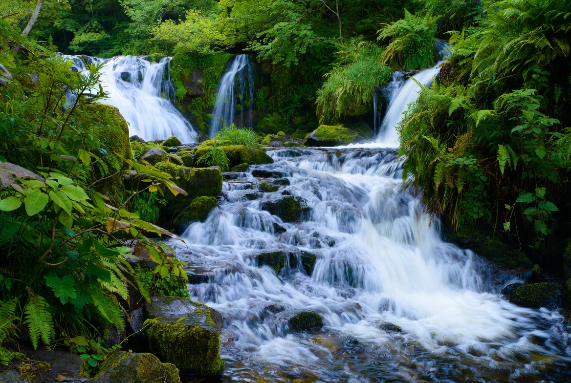 cascade, ferns, flowing water, forest, green foliage, green forest, landscape, lush vegetation, mossy rocks, natural scenery, nature, rocky terrain, scenic view, stream, tropical plants, waterfall cascade, white water, waterfalls