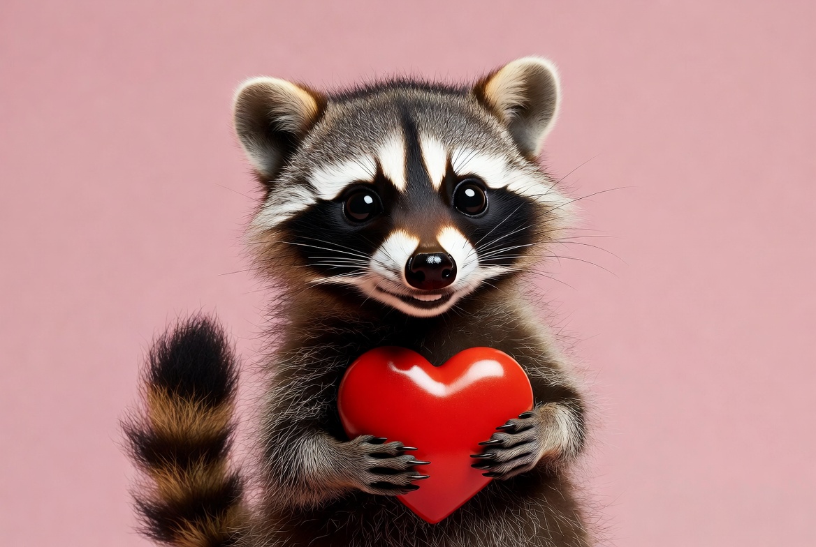 adorable, animal, black mask, cartoon animal, cute raccoon, fluffy fur, holding heart, illustration, love, paws, pink background, red heart, tail, valentine, wildlife, raccoon