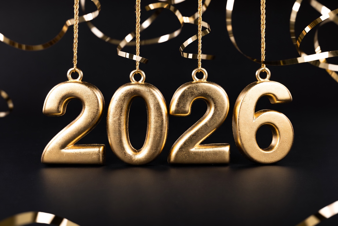 Shiny gold numbers forming '2026' hang from ribbons against a black background. Golden streamers drape around the metallic numerals. The design features a festive, elegant style with reflective surfaces.