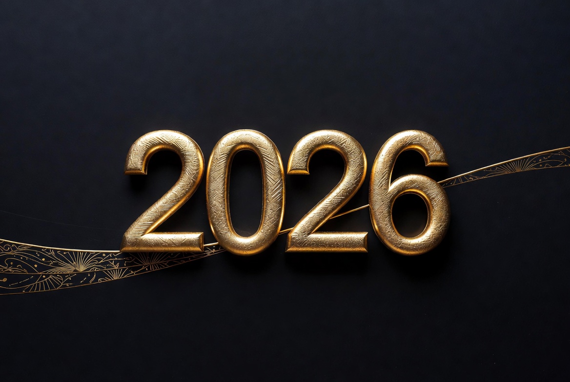 Shiny golden numbers forming '2026' stand out against a dark black background. Delicate golden wavy lines and patterns accentuate the base of the numerals. The image features a luxurious metallic texture with a subtle shine.