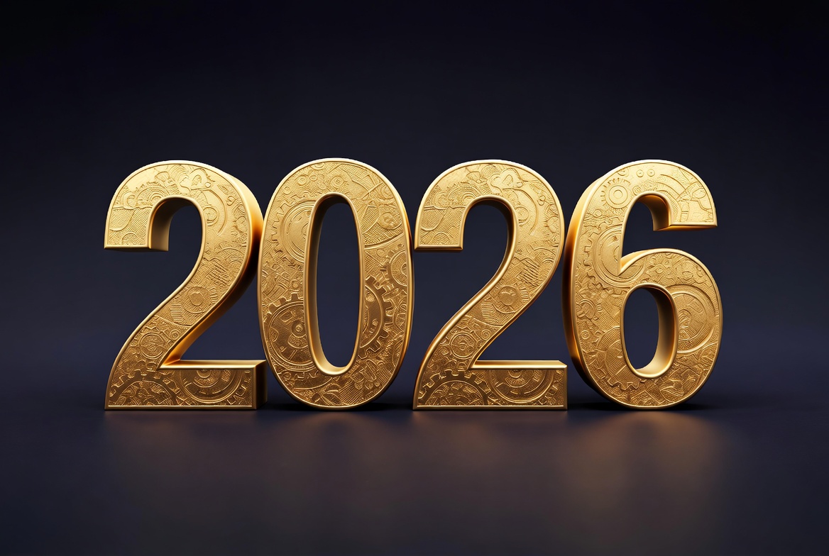 Shiny golden numerals forming the year 2026 stand prominently against a dark background. Each digit features intricate gear-like engravings and metallic textures. The design has a steampunk-inspired appearance with reflective highlights.