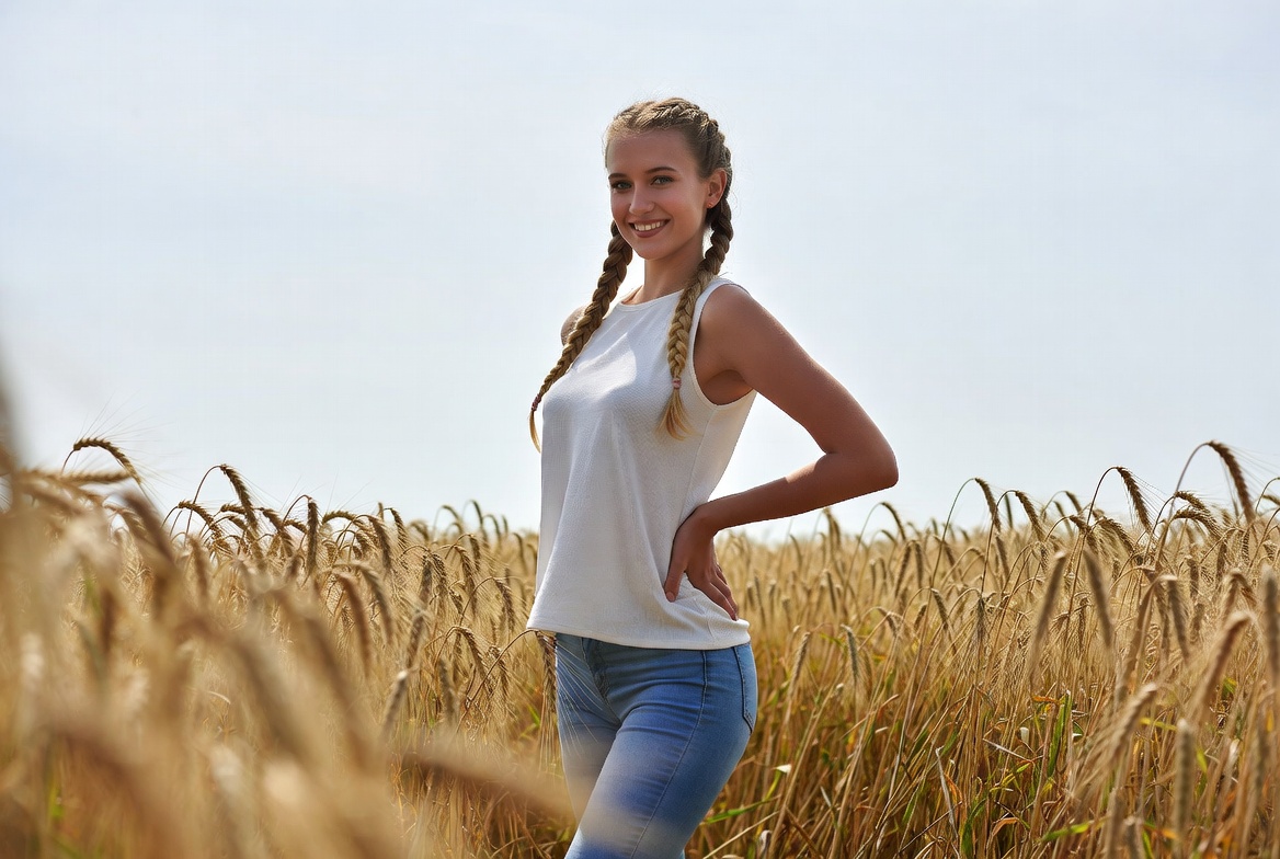 White, agriculture, blonde hair, blue jeans, braids, female, field, golden wheat, hand on hip, happy, nature, outdoor, pigtails, portrait, side view, smiling, summer, sunny day, tank top, wheat field, white top, young woman, woman