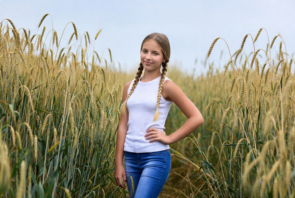 A young girl with blonde hair in braids stands confidently in a golden wheat field. She wears a white tank top and blue jeans, with one hand on her hip. The field surrounds her under a clear sky.