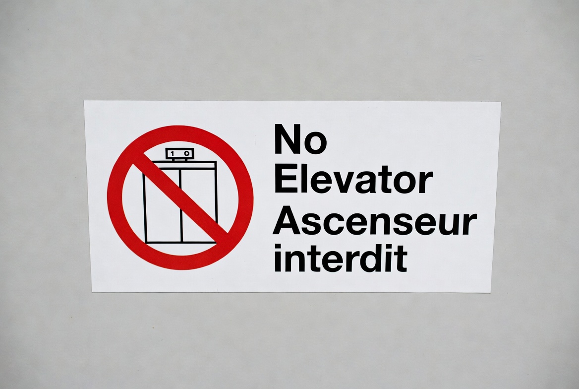 French English, bilingual sign, clipart, elevator doors, elevator prohibited, elevator symbol, illustration, interdit ascenseur, isolated background, no entry, prohibition sign, red slash, safety sign, white sign, no elevator sign