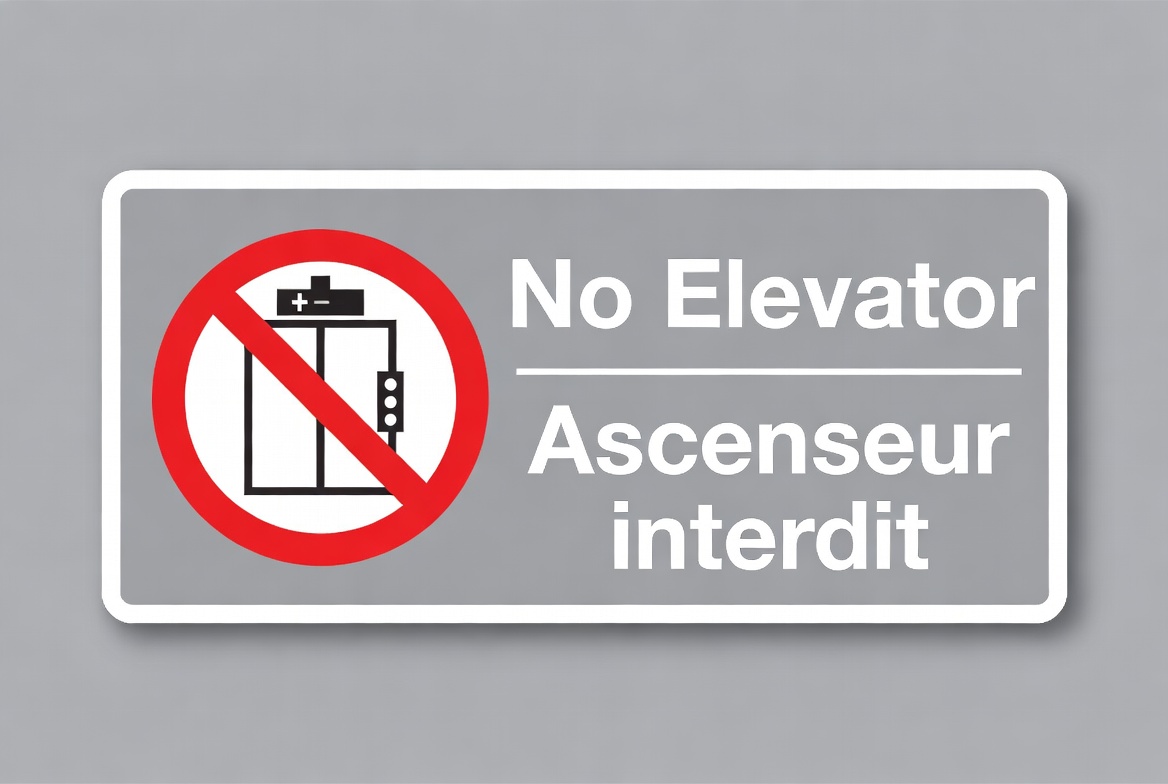 A rectangular gray sign with a red prohibition circle over a black elevator icon prohibits elevator use. The text 'No Elevator' appears in English above the icon, and 'Ascenseur interdit' in French below it. The sign features a simple, bold design on a light gray background.