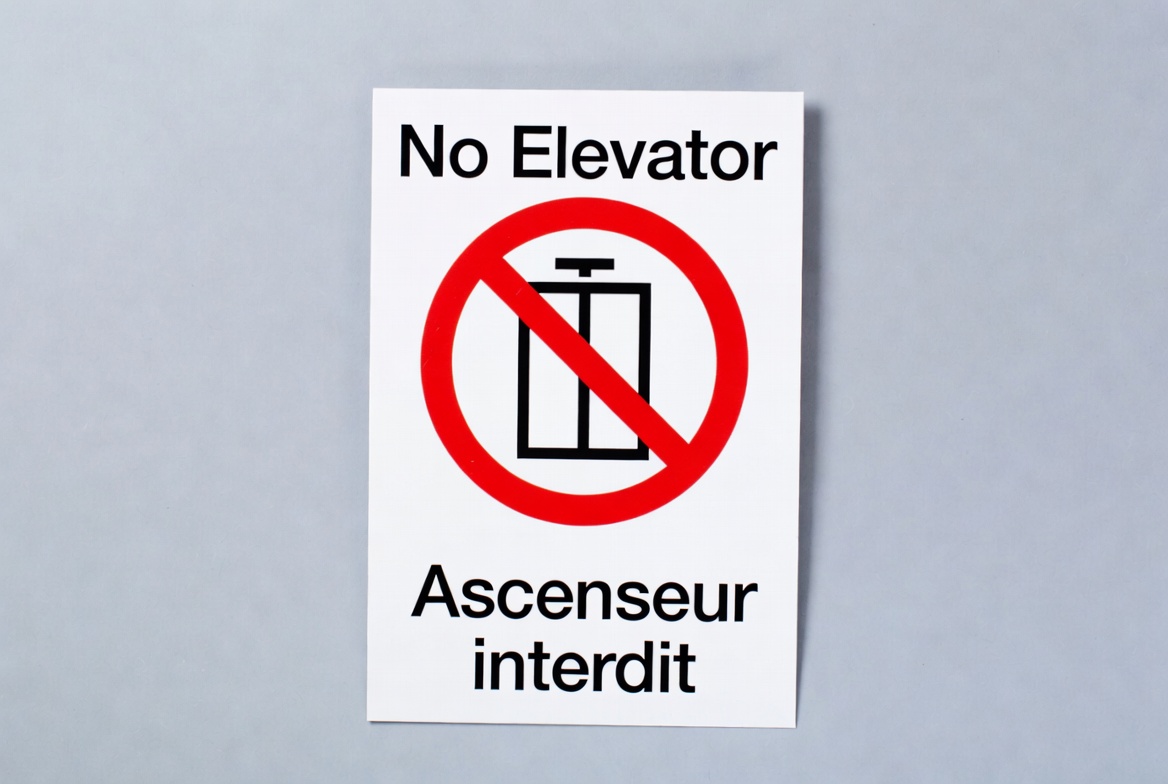 Ascenseur interdit, English French, bilingual sign, elevator icon, elevator prohibited, elevator symbol, gray background, no elevators, prohibition sign, red prohibition symbol, red slash, restricted access, safety sign, signage, warning sign, white sign, no elevator sign