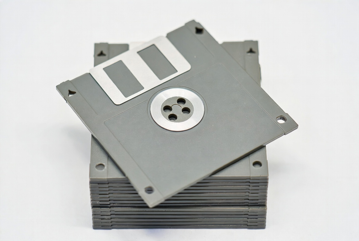 A stack of gray 3.5-inch floppy disks sits on a white background. One floppy disk is tilted on top, revealing its metal shutter and circular hub. The disks feature black plastic corners and white labels.