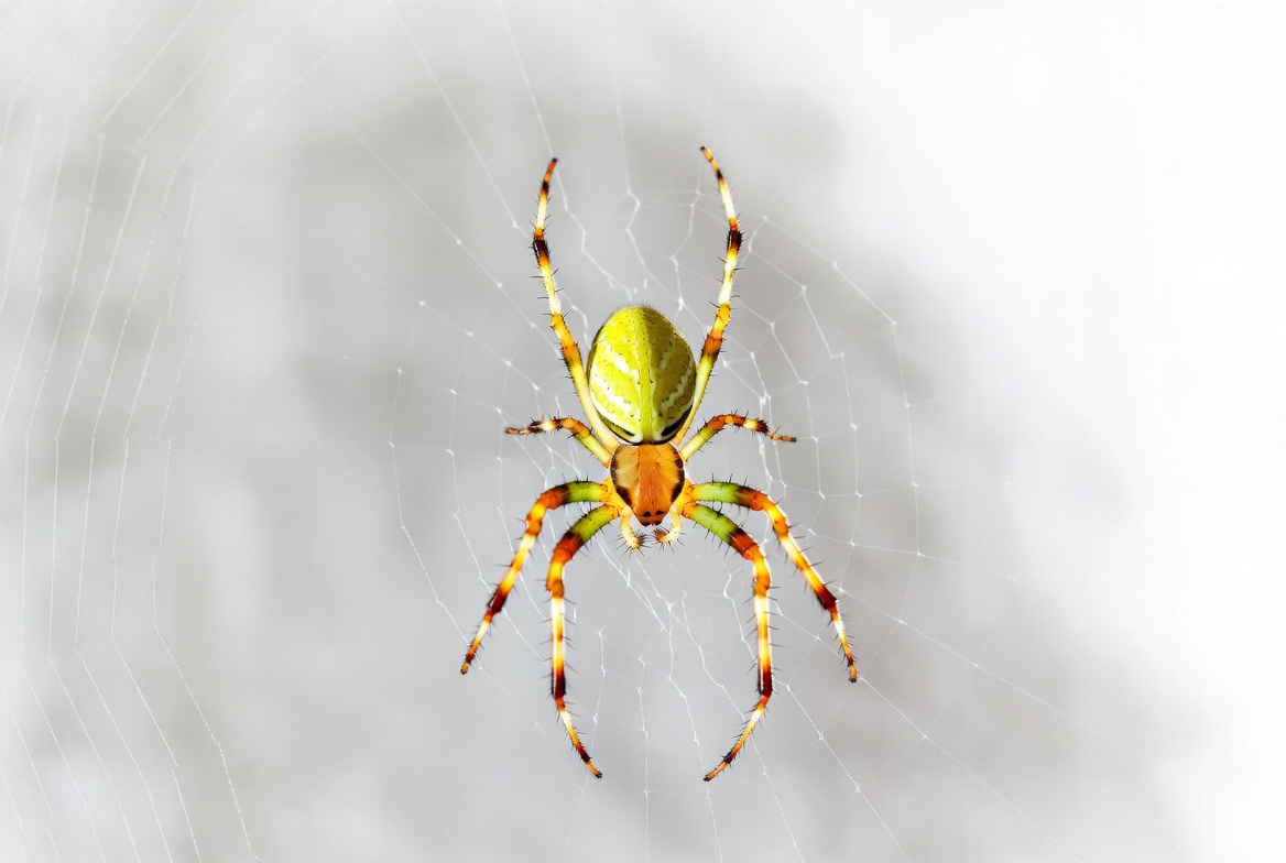 animal, arachnid, banded legs, closeup, green body, green spider, insect, isolated background, long legs, macro photo, nature, orange markings, spider legs, spider web, vibrant colors, wildlife, yellow spider, lynx spider