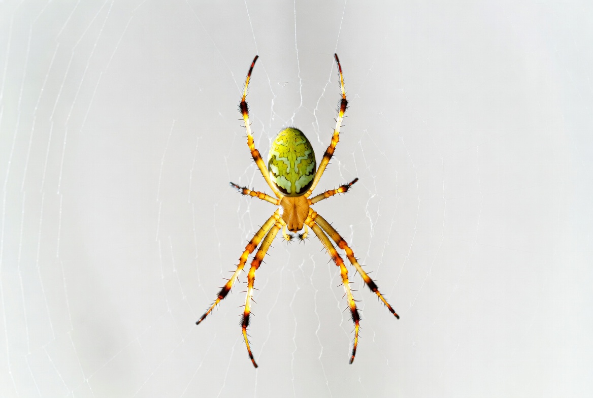 arachnid, black legs, creepy crawly, green spider, insect, isolated background, legs, macro, nature, orb weaver, spider web, white web, wildlife, yellow markings, spider