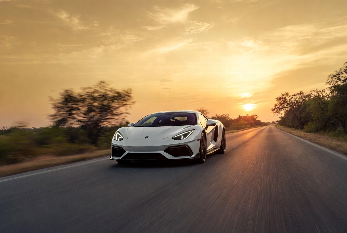 White Lamborghini Driving at Sunset