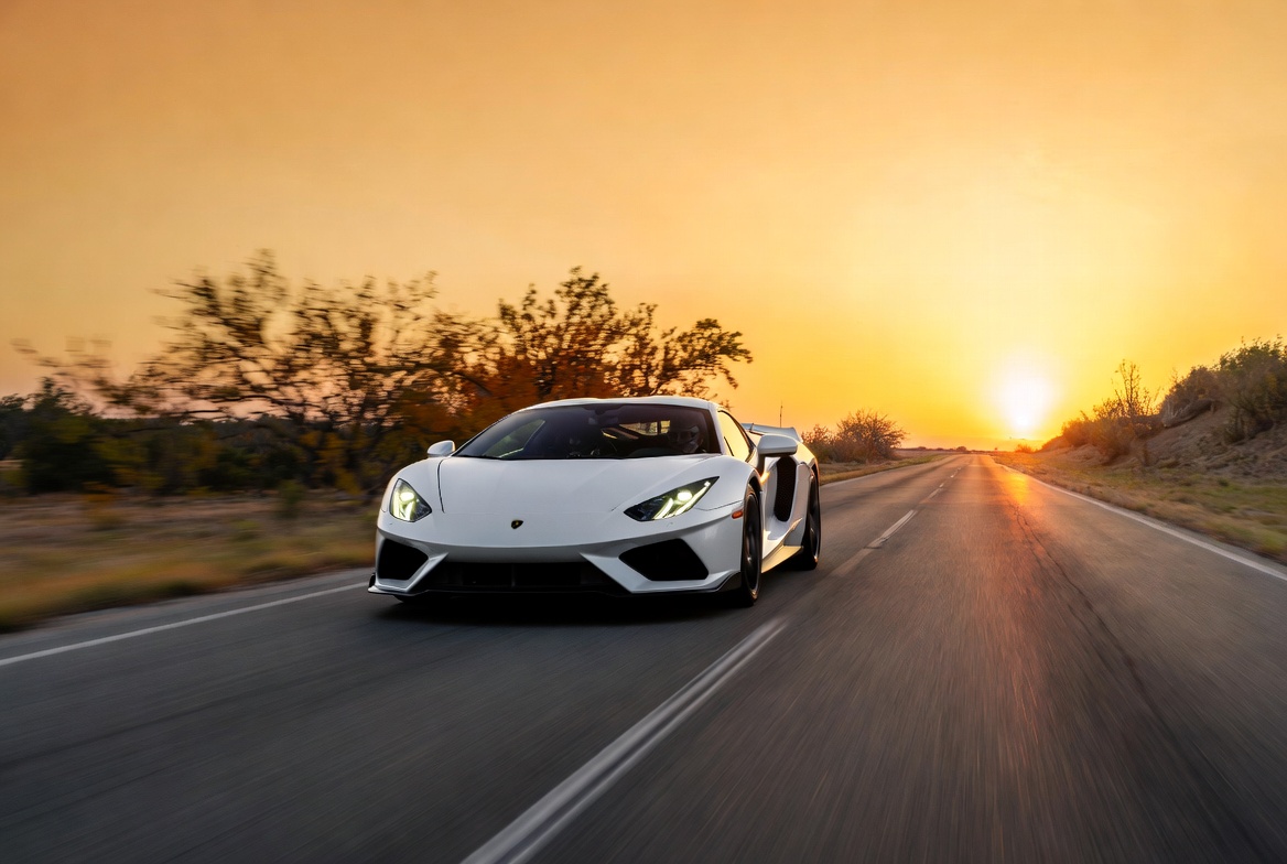 White Lamborghini Driving at Sunset