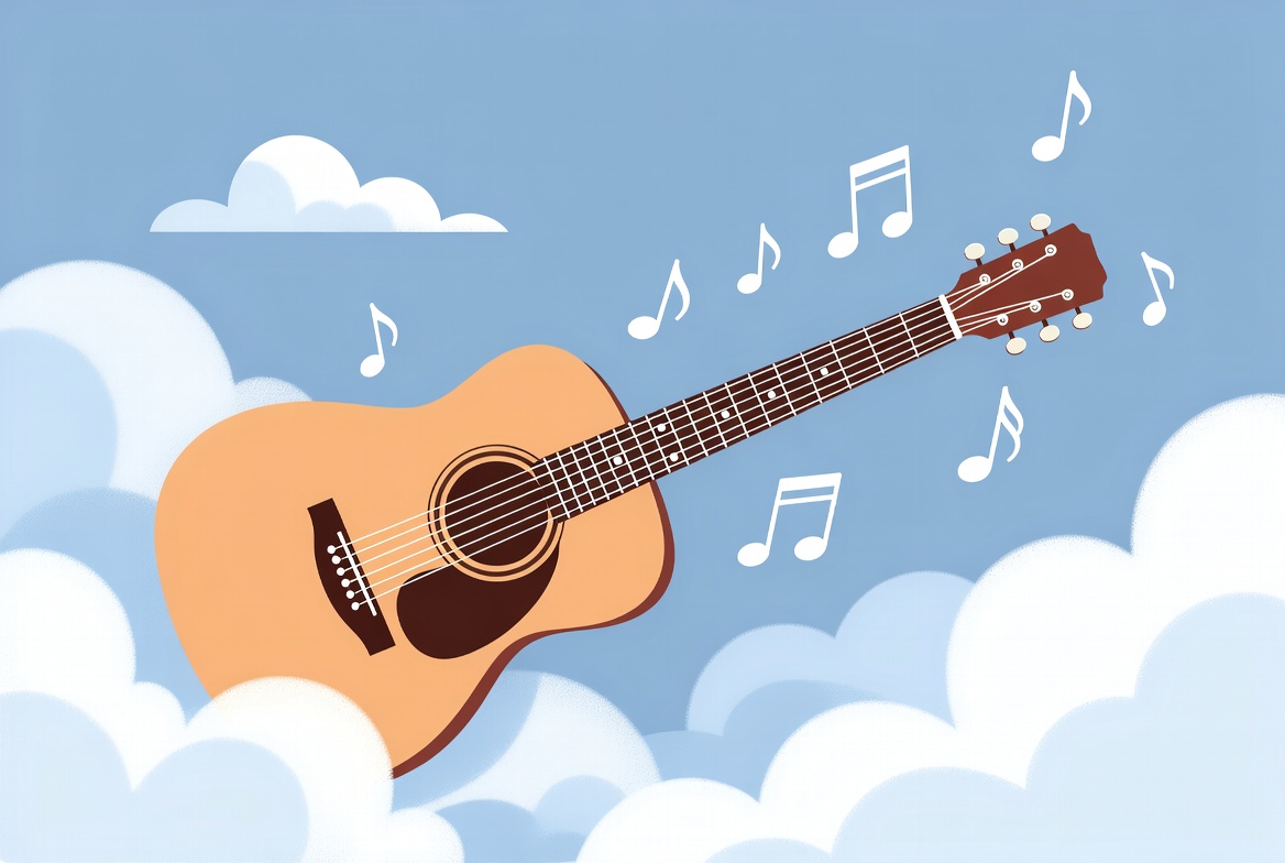 A cartoon acoustic guitar floats among fluffy white clouds on a blue sky background. Musical notes surround the guitar, drifting upwards. The illustration features a wooden guitar with a round sound hole and strings.