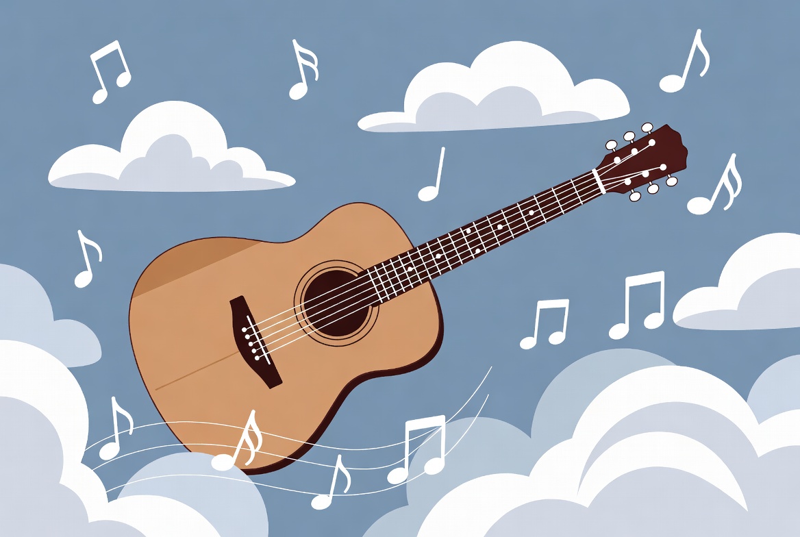 A brown acoustic guitar floats among white fluffy clouds on a blue sky background. Musical notes in black surround the guitar and drift through the clouds. The illustration features a simple, cartoonish style with vibrant colors.