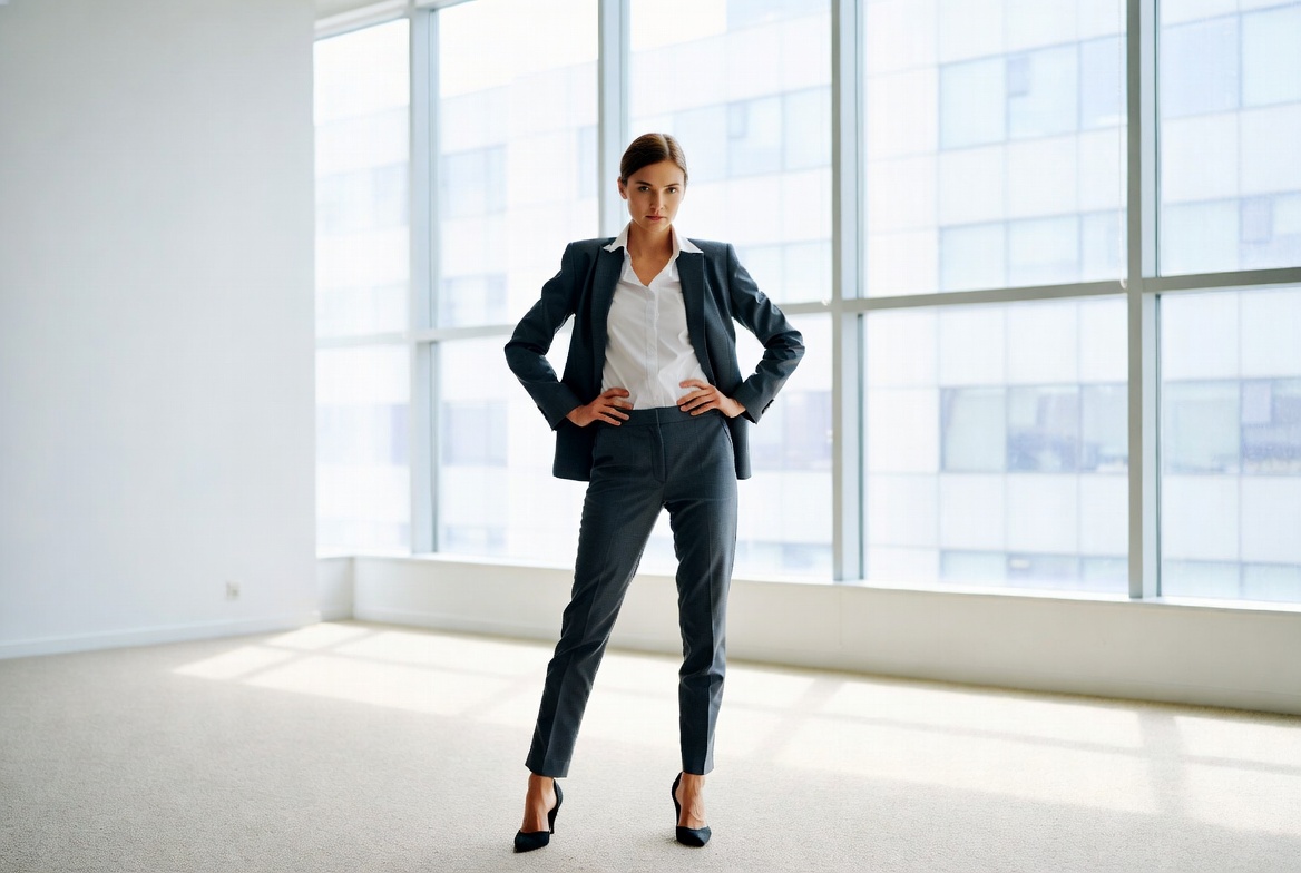 Confident woman in suit by office windows