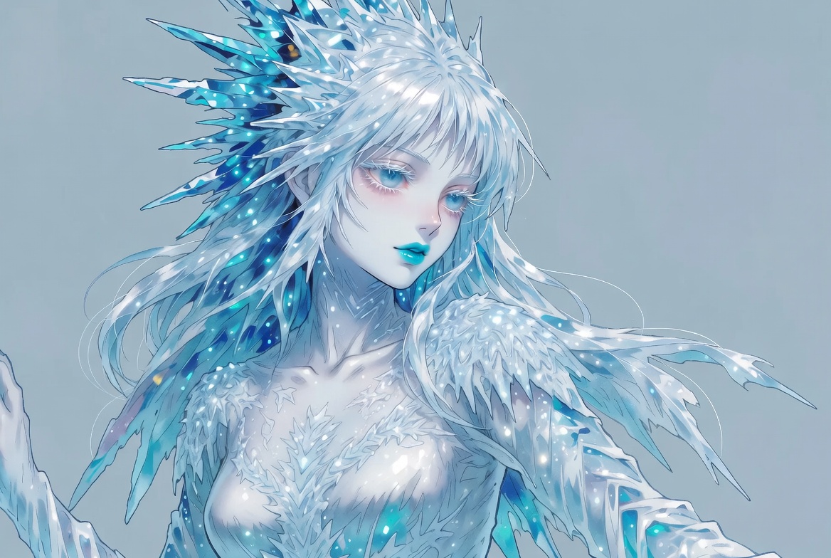 A beautiful anime-style ice queen with long silver hair adorned with icy spikes stands against a gray background. She has pale blue skin, striking blue eyes, and glossy cyan lips, wearing a form-fitting icy dress with crystalline details. Large feathered wings covered in frost extend from her shoulders, and she poses gracefully with one hand raised.