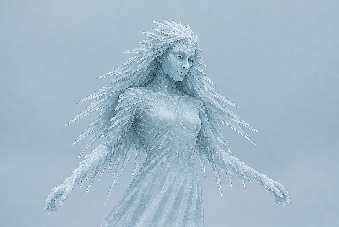 A digital illustration depicts a female figure made entirely of translucent ice and frost. She has long, spiky icy hair flowing backwards and wears a flowing icy dress. Her arms are extended gracefully against a plain blue background.