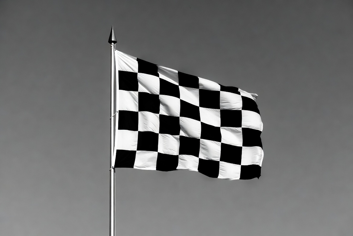 auto racing, black white flag, checkered pattern, competition, fabric flag, finish line, flag pole, flag waving, gray sky, high contrast, isolated background, metal pole, monochrome, motorsport flag, pointed top, racing, racing flag, speed, square pattern, waving flag, checkered flag