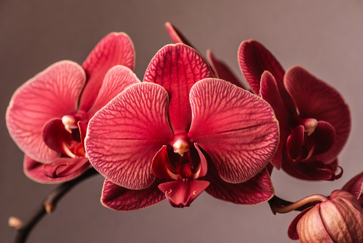blooming flowers, closeup, exotic flower, floral, flower, flower closeup, flowers, isolated background, petals, phalaenopsis, phalaenopsis orchid, pink flowers, plant, red flowers, red orchid, tropical flower, veined petals, orchid