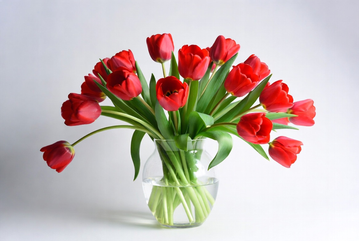 blooming tulips, bouquet, floral arrangement, flowers, glass vase, green stems, isolated background, red flowers, spring flowers, tulips, vase, red tulips