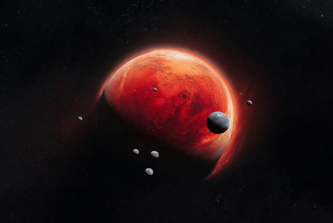 A vibrant red planet resembling Mars floats in the dark expanse of space. Surrounding it are several small gray moons and distant stars. The image features a realistic digital illustration with glowing atmospheric effects.