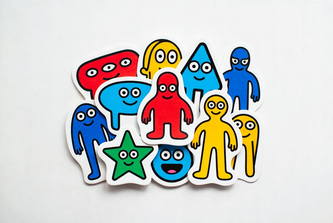 abstract faces, blue figure, bright colors, clipart, colorful stickers, expressive eyes, fun cartoons, geometric shapes, green star, hand drawn, happy faces, illustration, isolated background, playful designs, red figure, stick figures, vector art, white background, yellow figure, cartoon characters