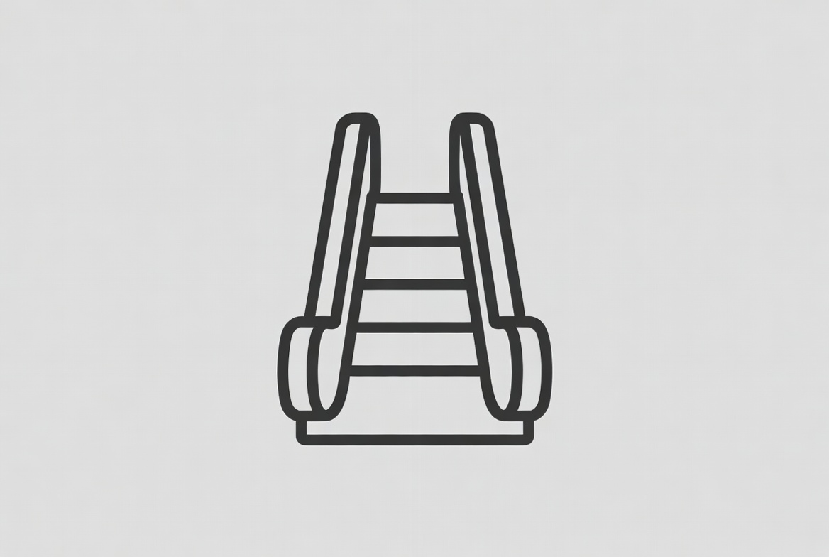 black lines, clipart, gray background, handrails, icon, illustration, isolated background, line art, minimalist design, moving stairs, outline, simple icon, steps, upward escalator, vector, escalator