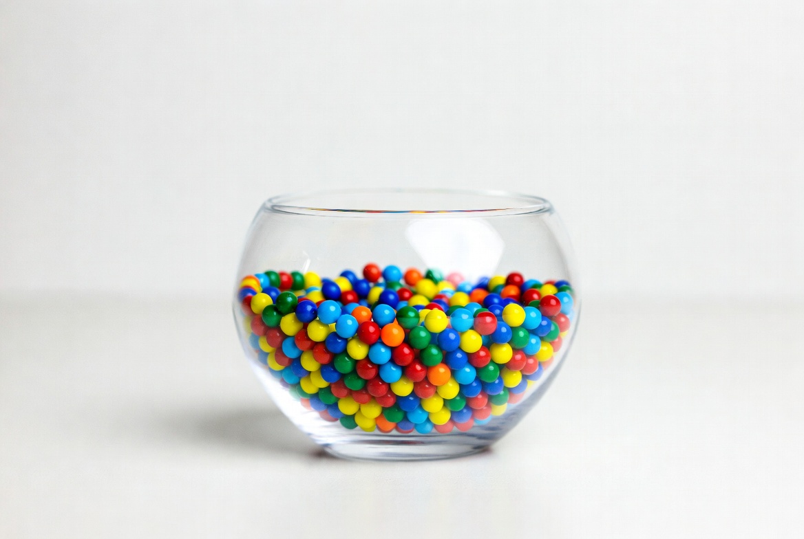 A clear glass bowl filled with multicolored small round candy balls sits on a white surface. The candies feature vibrant shades of red, blue, green, yellow, and orange. The bowl is transparent, showcasing the colorful contents inside.