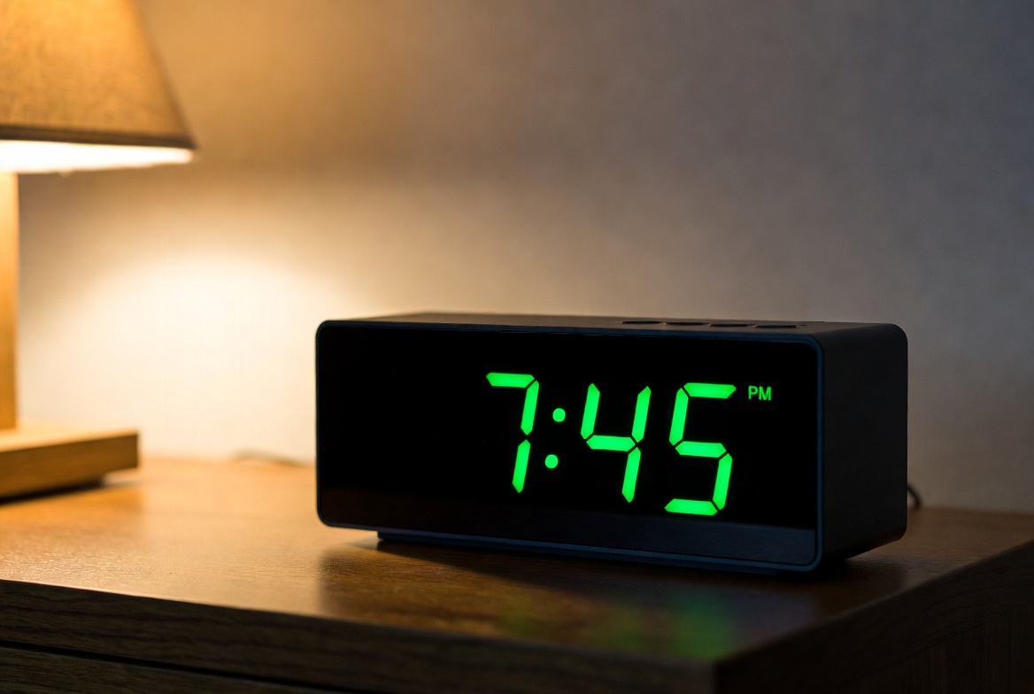 7:45 PM, LED clock, bedroom clock, bedside clock, bedside lamp, black clock, clock glowing, dark background, digital clock, evening time, green display, isolated clock, lampshade, night time, time display, warm lighting, wooden table, alarm clock