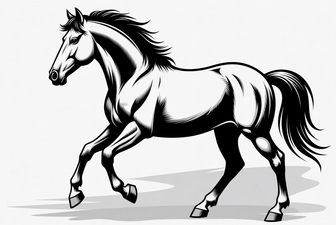 A black and white vector illustration of a majestic horse galloping dynamically. The horse features a flowing mane and tail, muscular legs in motion, and a detailed shaded outline on an isolated white background.