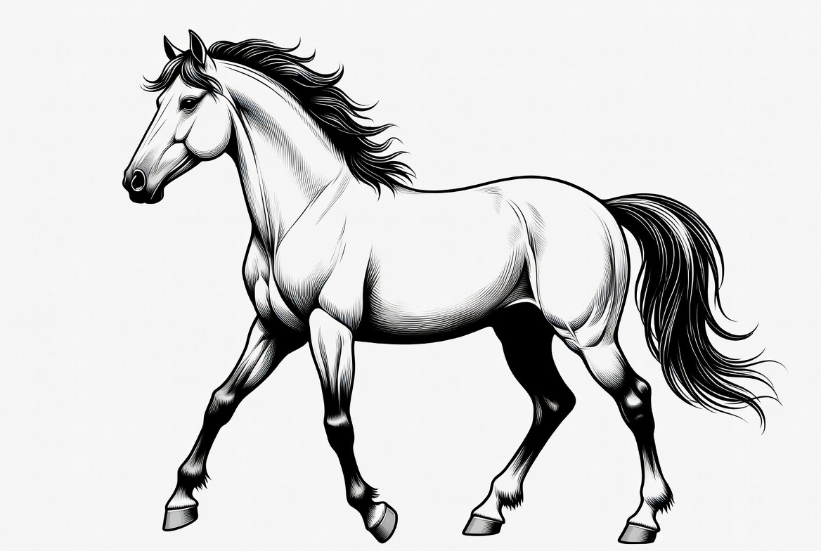 A detailed black and white illustration of a majestic white horse walking with flowing mane and tail. The horse has a muscular build, dynamic pose, and is depicted on an isolated white background. Fine ink lines emphasize its elegant movement and features.