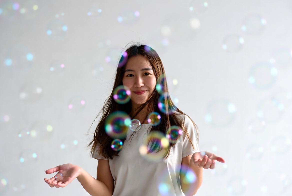 A young Asian woman with long dark hair smiles while standing amid floating colorful soap bubbles on a white background. She wears a light-colored short-sleeved top and holds her hands out with palms up. The bubbles in shades of pink, blue, and clear surround her face and body.