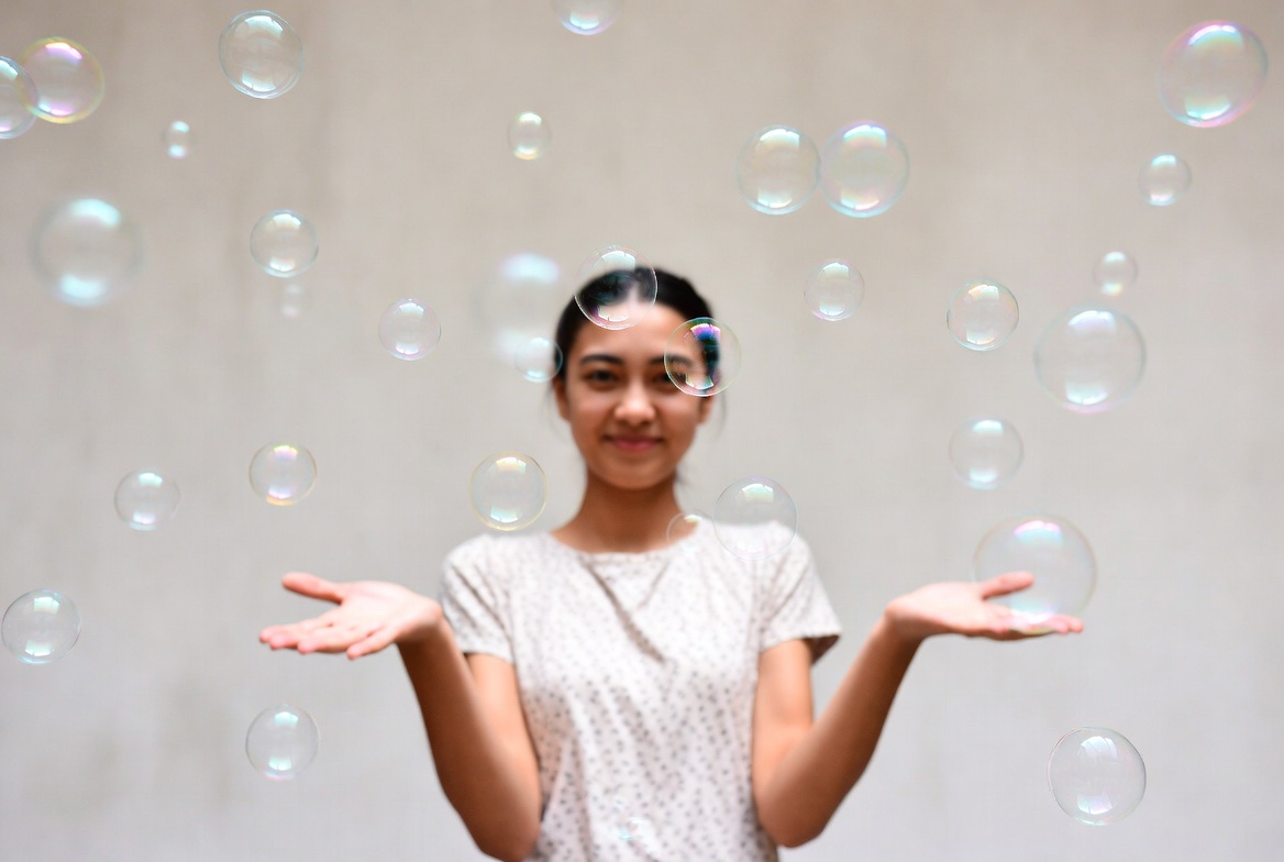 A young Asian woman with dark hair smiles at the camera while surrounded by numerous floating soap bubbles. She wears a light-colored short-sleeved top and holds her hands out with palms up. The bubbles are scattered in the air against a plain light background.