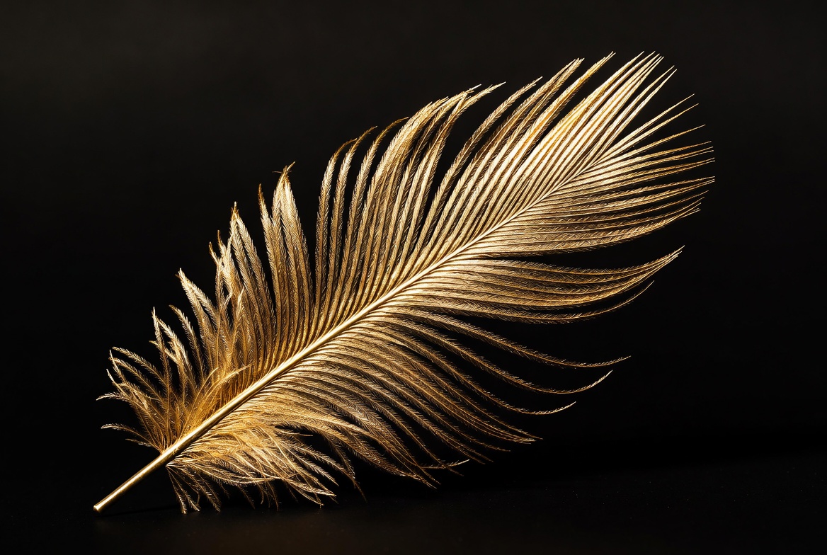 A large golden feather lies diagonally on a solid black background. The feather features intricate fringed edges and a metallic gold sheen. It is isolated with sharp focus and dramatic lighting.