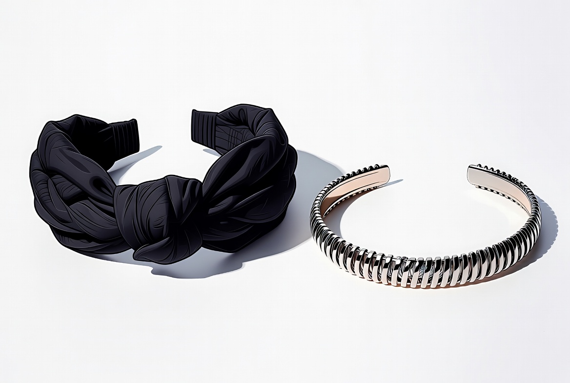 accessories, bangle, black headband, bracelet, cuff bracelet, fabric headband, fashion accessory, hair accessory, hairband, isolated background, jewelry, knotted headband, ridged bangle, shiny metal, silver bangle, twisted design, women's fashion, headband