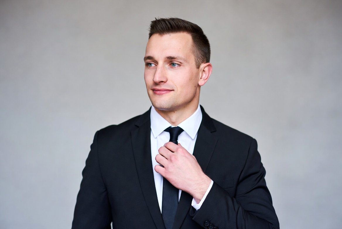 A young White man with short brown hair stands against a gray background wearing a black suit and white shirt. He is adjusting his black tie with his right hand. His expression is neutral as he looks slightly to the side.