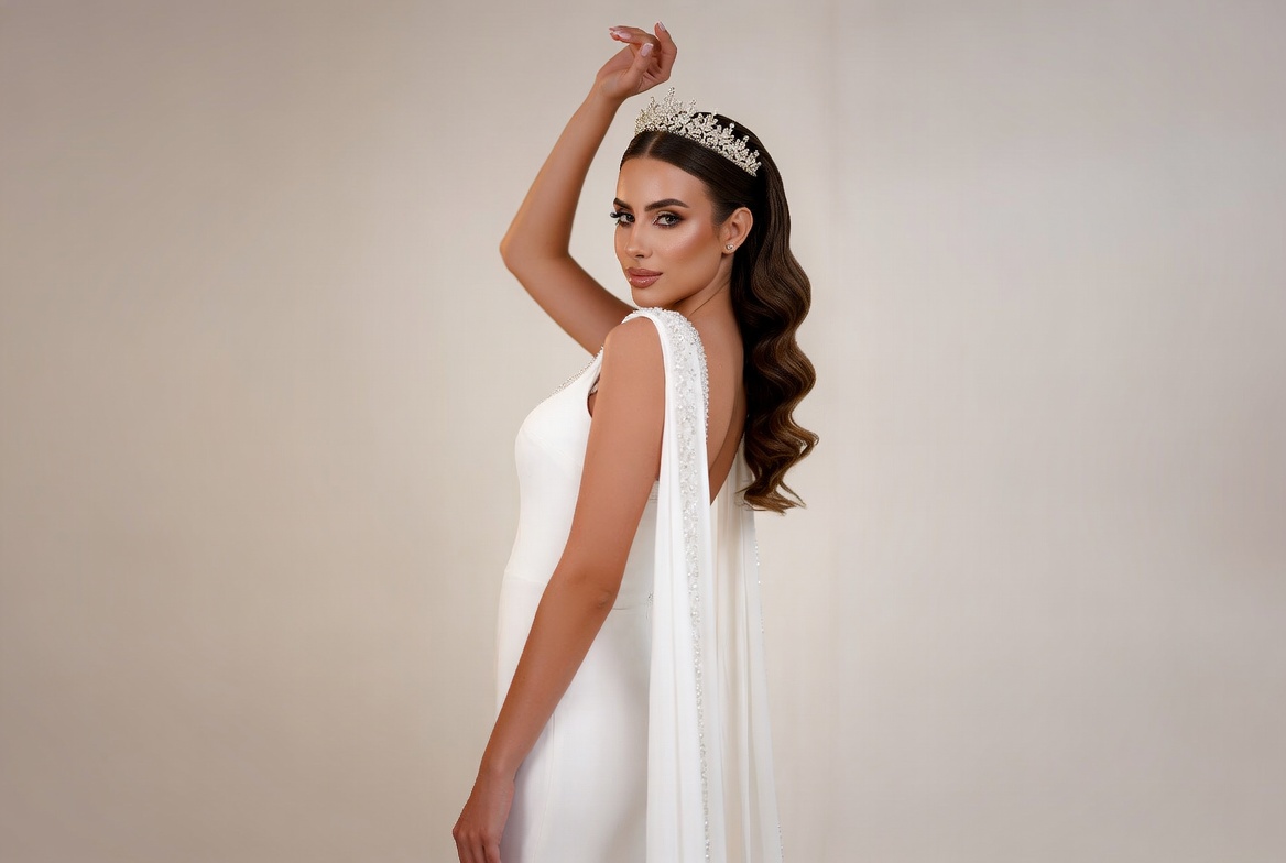 A woman stands sideways in a form-fitting white wedding gown with flowing cape sleeves against a plain background. She wears a sparkling tiara in her wavy brunette hair and poses with one arm raised gracefully. Her makeup is glamorous, highlighting her eyes and lips.